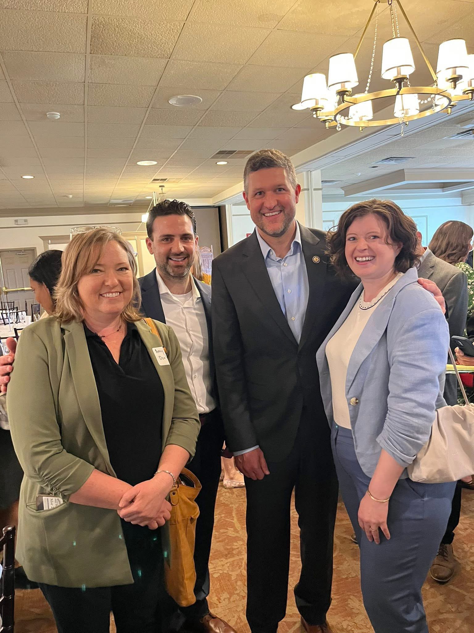 Four professionally dressed individuals standing together at an indoor event, smiling at the camera, with a warmly lit social gathering in the background.