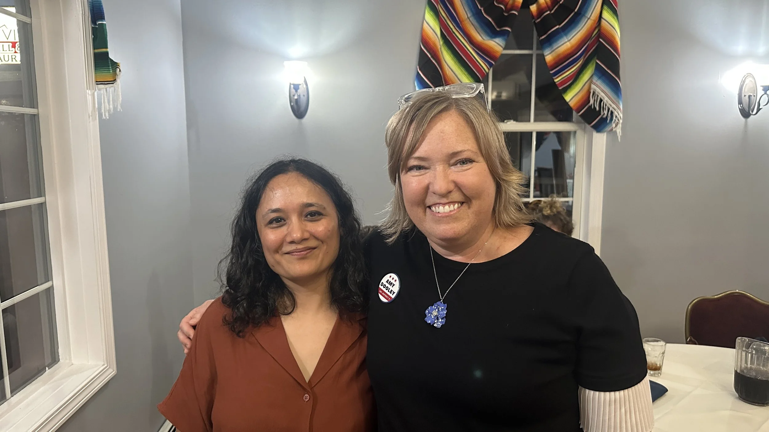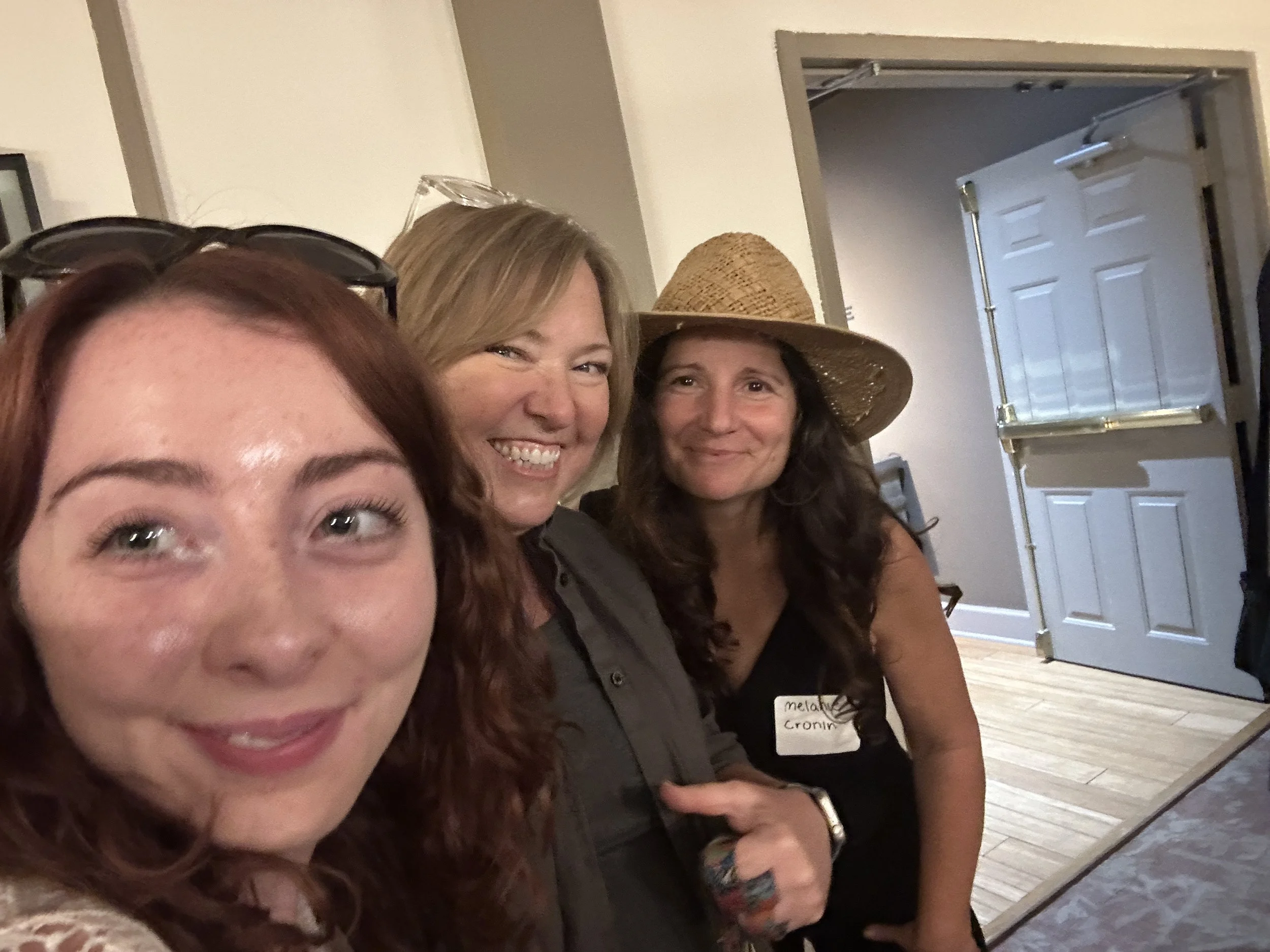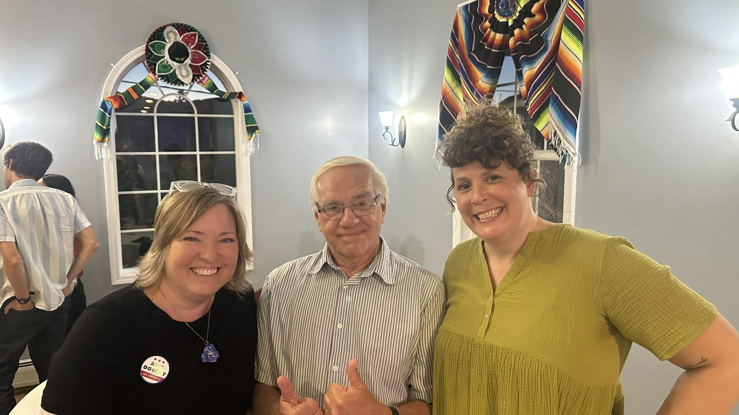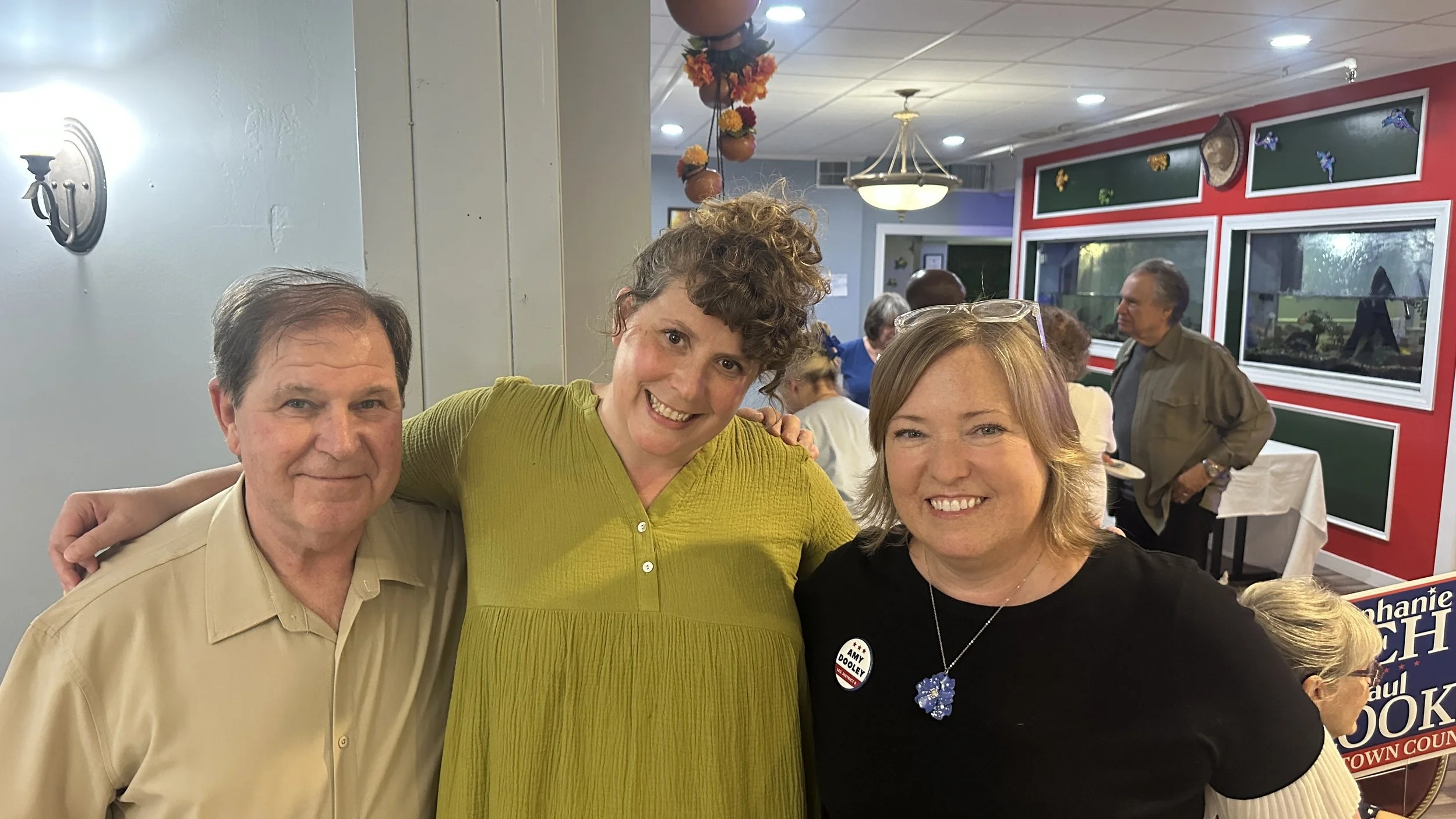 Three people smiling at a social gathering, standing close together. The person on the left is a man in a beige shirt, the one in the middle is a woman with curly hair in a green top, and the person on the right is a woman with glasses on her head, wearing a black shirt. There are other people and decorations in the background, with a political sign visible on the right.