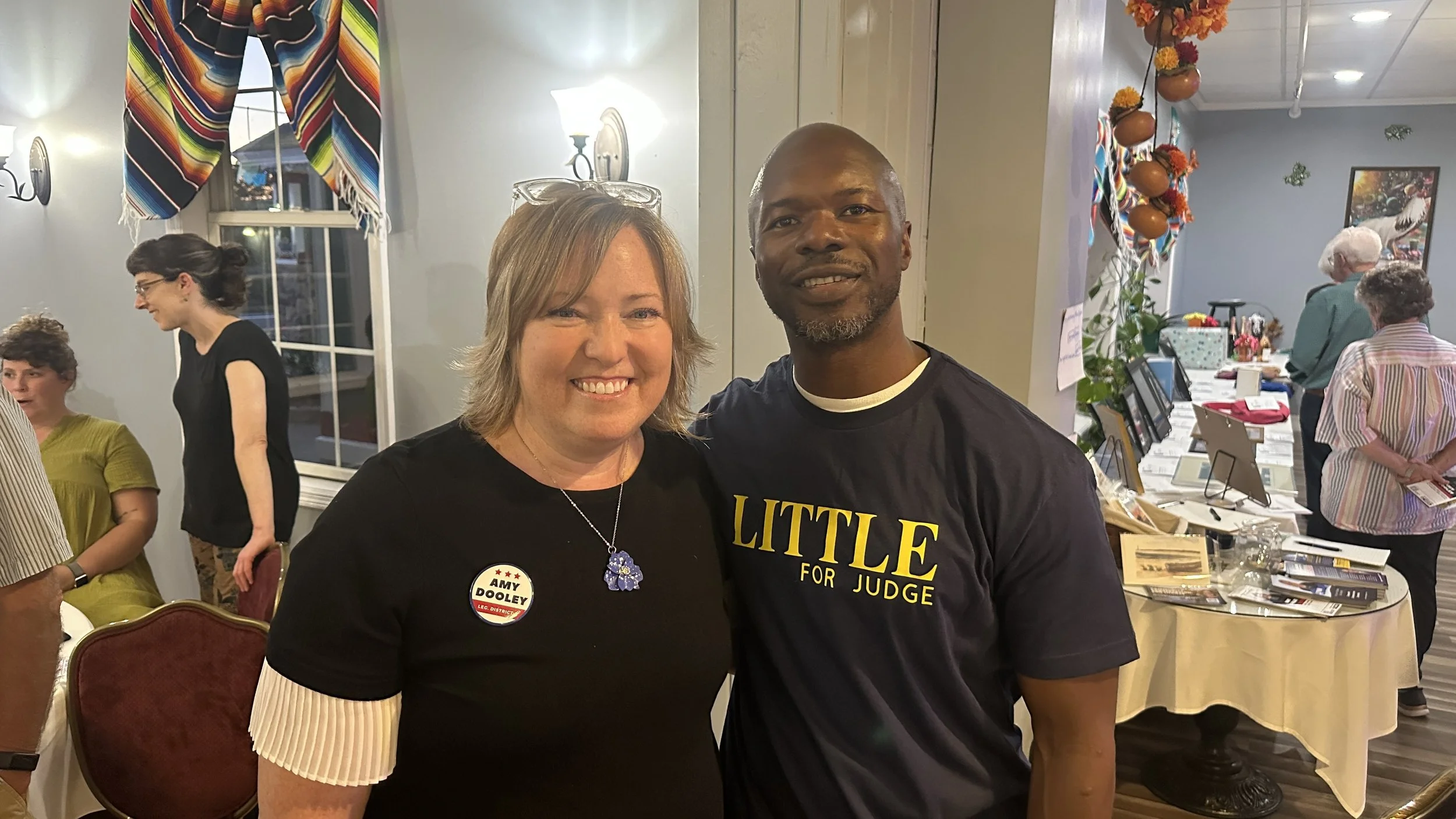 Smiling woman with a campaign button and a man wearing a shirt that says 'Little for Judge' in a room with other people, tables, and decorations.