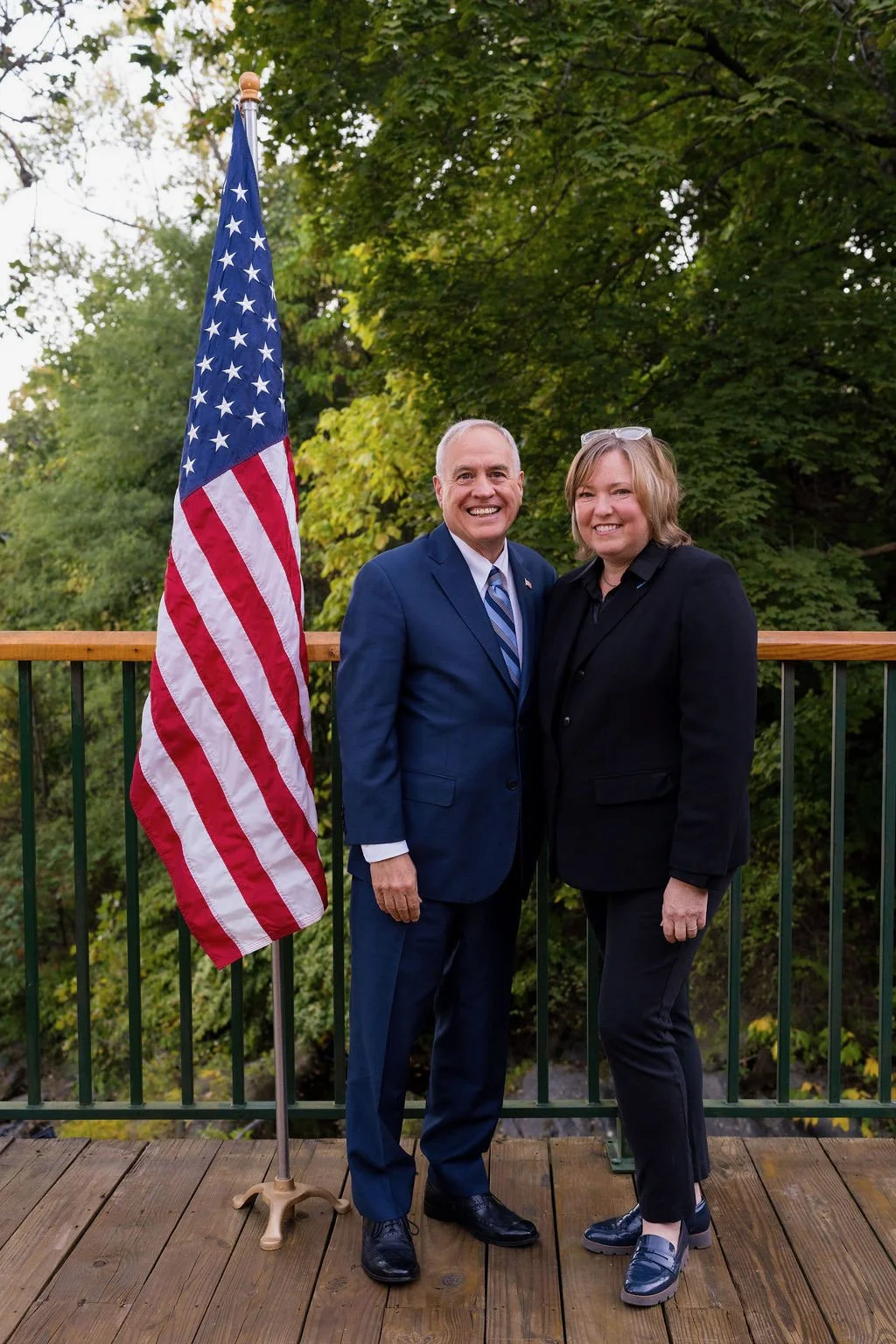 A man and woman smiling and standing together on a wooden deck, with an American flag on a pole to the left, surrounded by green trees.