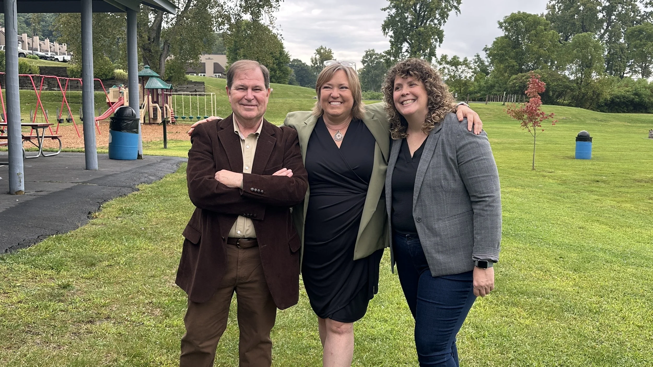 Legislator Joe Donaldson, Candidate Amy Dooley, and Legislator Megan Speery, standing outdoors in a park, smiling, with play equipment and trees in the background.