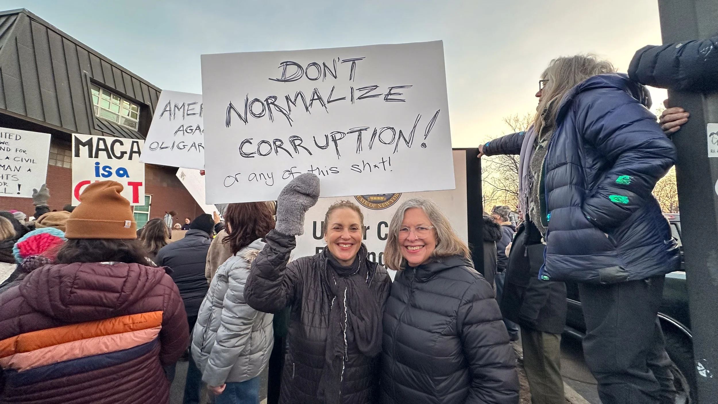 Two women protestors smiling and holding a sign that reads 'Don't normalize corruption! or any of this sh*t!' during a protest, with a crowd and other protest signs in the background.