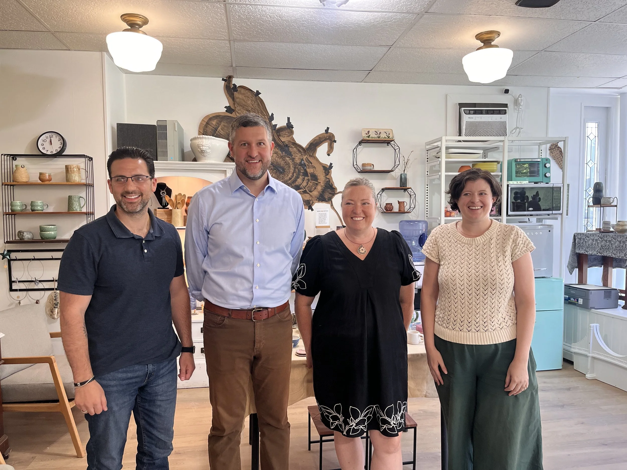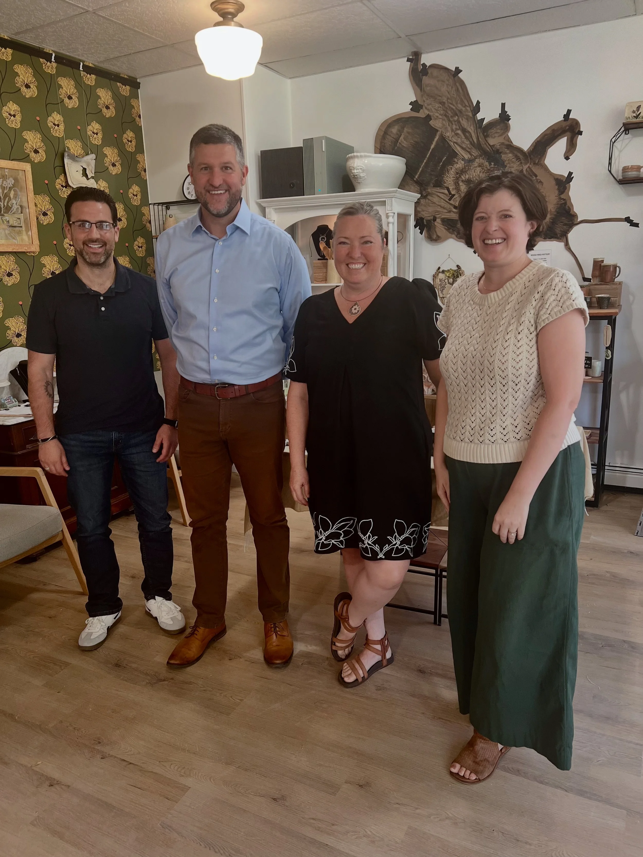 Four people standing indoors, smiling, in a room with wooden flooring and decorated walls.