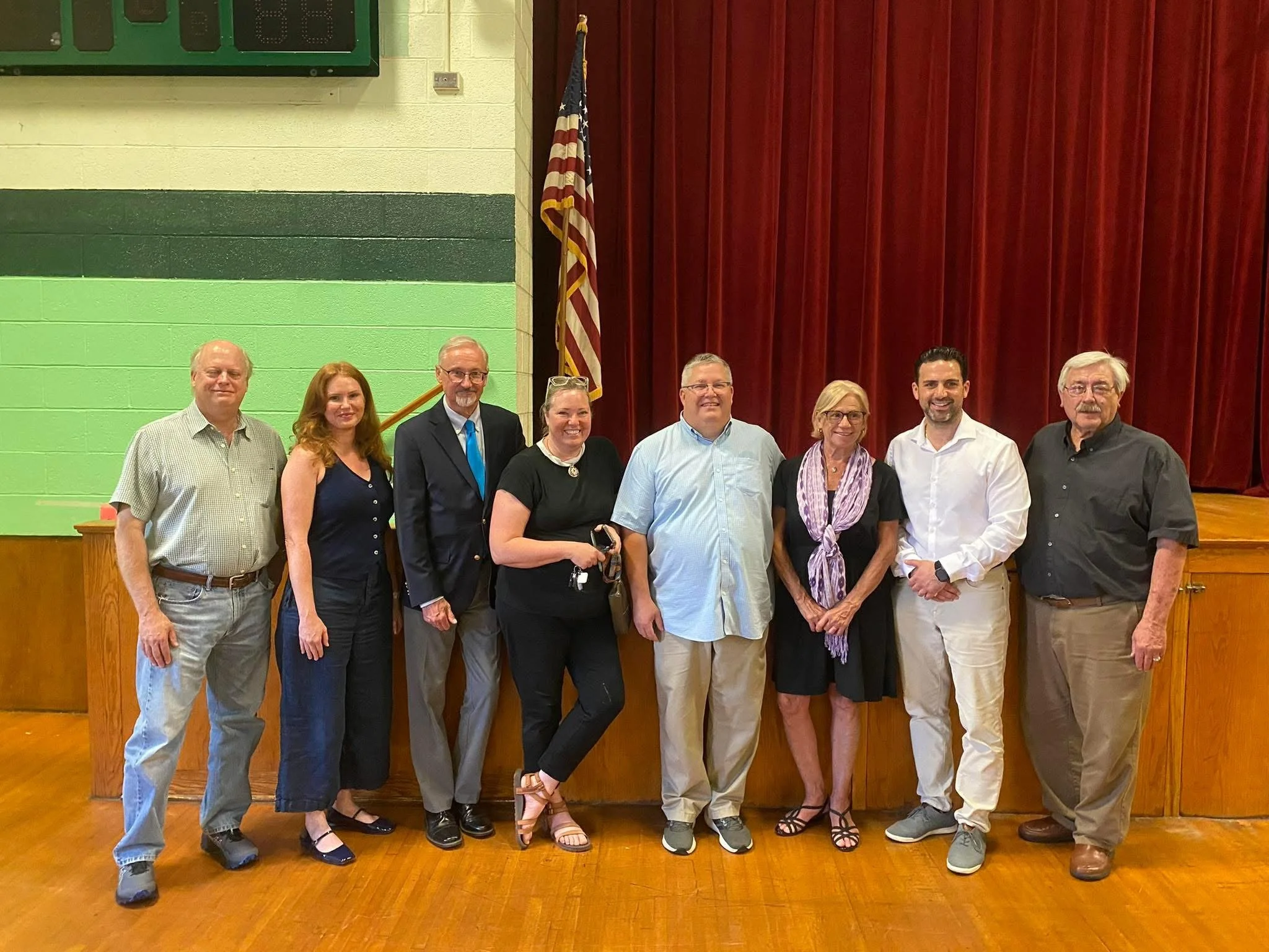 A group of six diverse adults smiling and posing together in a gymnasium with blue bleachers and flags in the background.