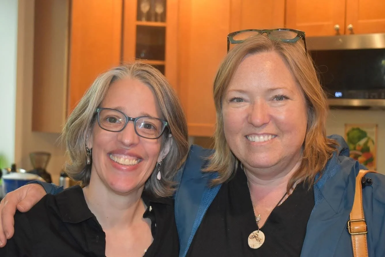 Two women standing inside a room, smiling at the camera. One woman is wearing a brown top, and the other is wearing a black top with glasses on her head. A man is visible in the background.