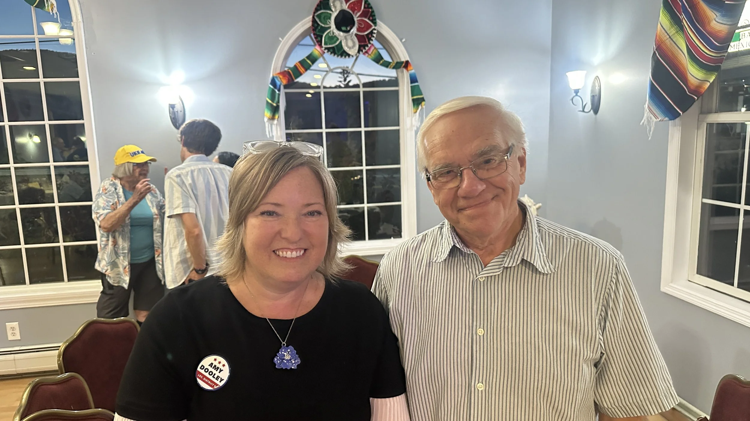 A woman and an older man are standing together indoors, smiling for the camera. The woman is wearing a black shirt with a button that says "Amy Doolay" and a necklace with a blue pendant. The man is wearing glasses and a light striped shirt. In the background, there are other people, brightly colored decorations, and a window showing the evening outside.