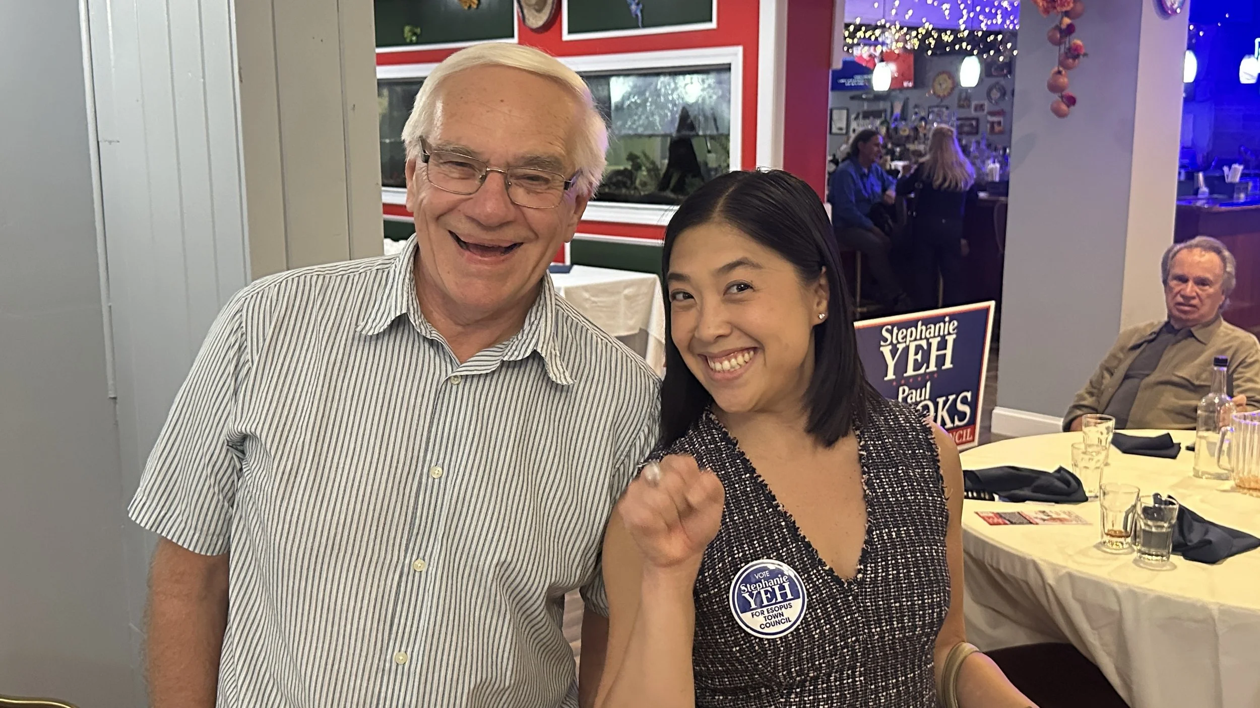 A smiling older man with glasses and a young woman at a social event, with campaign signs for Stephanie Yeh for Escondido Town Council in the background.