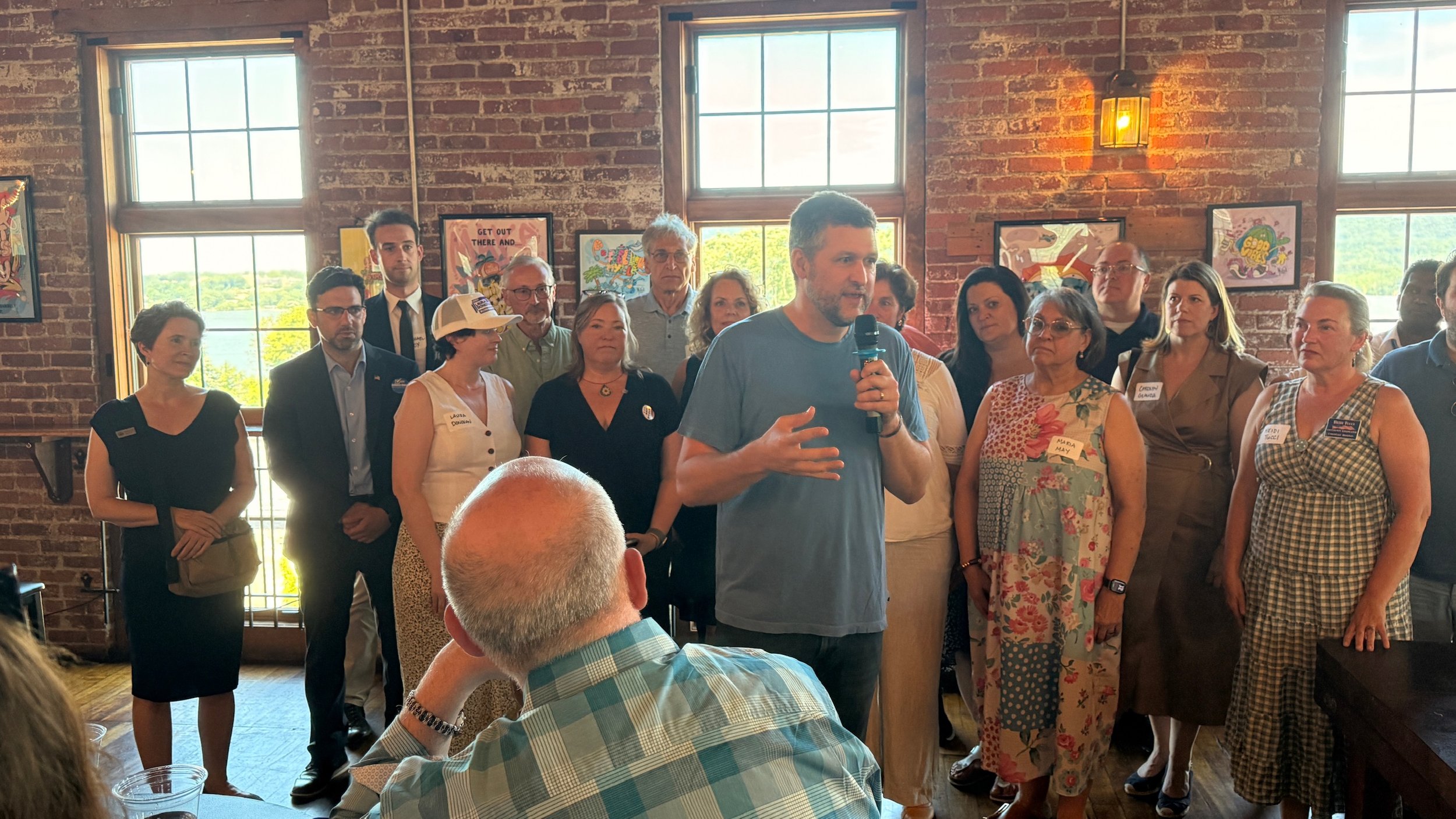 A man holding a microphone and speaking to an audience in a room with brick walls, large windows, and artwork, surrounded by a diverse group of people listening attentively.